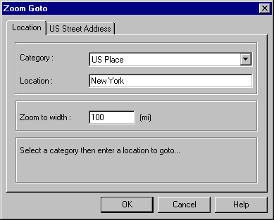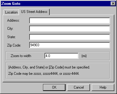 You can use the Zoom Goto dialog box to zoom to a location, such as an airport, or to a US street address or ZIP code.