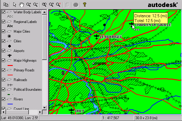 You can measure the distance between two points on the map. You can also measure the distance between several points to get a cumulative total distance. For example, if you want to know approximately how far you would travel if you flew from Paris to London to New York, you could measure each leg of the trip and get a cumulative total. Note that, depending on which map projection the author of the map chose, the distances measured may vary in accuracy. For example, if the map author chose a projection that provides the most accurate results when you measure the distance between two points in France, the accuracy will decrease if you measure the distance between points across the world. For more information, contact the author of the map.