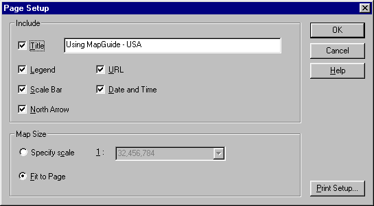 When you print a map, you can include a title, a legend, the map's scale, a North arrow, the map's URL, and the current date and time. Also, you can specify the scale of the map you want to print, or you can have MapGuide automatically scale the map to fit the printed page. The following steps explain how to print the map when you use the PRINT > PRINT command from the popup menu in Autodesk MapGuide Viewer. If your map is embedded (if it appears within a web page, rather than appearing in its own window), and you use your web browser's print commands, the settings you specify in the following steps will not affect the way the map prints.